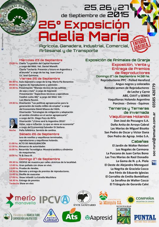 El próximo fin de semana en Córdoba se realizará en el predio de la Sociedad Rural de Adelia María la 26 exposición rural en el predio ubicado en la Av. San Martín 275.