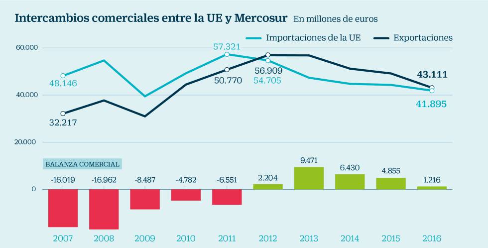 Las relaciones comerciales entre ambos bloques han seguido un camino inverso desde el estallido de la crisis financiera mundial. En 2008, las exportaciones de la UE a Mercosur llegaron a 32.127 millones de euros y nueve años después han crecido un 34,2% hasta los 43.111 millones. En el mismo período, las importaciones de la UE han bajado un 13% desde los 48.146 a los 41.895 millones de euros. En nueve años se ha pasado de un superávit comercial para Mercosur de 16.962 millones de euros a un déficit de 1.216 millones de euros.